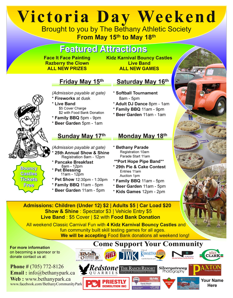 You can follow Bethany Park on Twitter @BethanyPark19 and Facebook at https://www.facebook.com/BethanyCommunityPark, and be sure to check out the events website (http://www.bethanypark.ca/events/40-victoria-day-weekend-is-coming.html) as the weekend approaches.